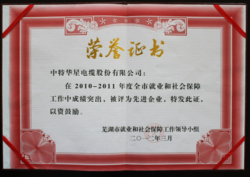 近日,中特华星电缆股份有限公司被芜湖市就业和社会保障工作领导小组评为“2010-2011年度全市就业和社会保障工作先进企业”。
