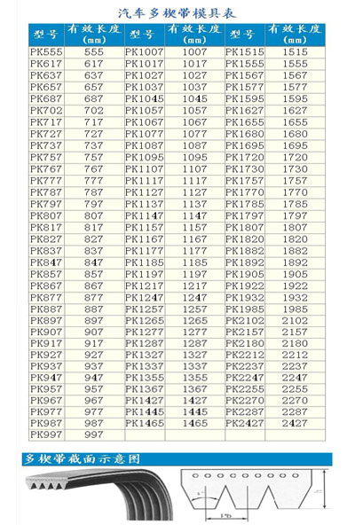 橡膠多楔帶兼 有v帶和平帶二者的優(yōu)點,既有平帶的柔軟、強韌的特點,又有v帶緊湊、高效等優(yōu)點。它的主要特點如下:1.傳動功率大,空間相同時比普通V帶的傳動功率的高30%。 2.傳動系統(tǒng)結(jié)構(gòu)緊湊,在相同的傳動功率情況下,傳遞裝置所占空間比普通V帶小25%。 3.帶體薄,富有柔軟性,適應帶輪直徑小的傳動,也適應高速傳動,帶速可達40m/s;振動小,發(fā)熱少,運轉(zhuǎn)平穩(wěn)。 ![]() 我公司主產(chǎn)的汽車多楔帶按照使用材料主要分為氯丁橡膠多楔帶和三元乙丙橡膠多楔帶。 |