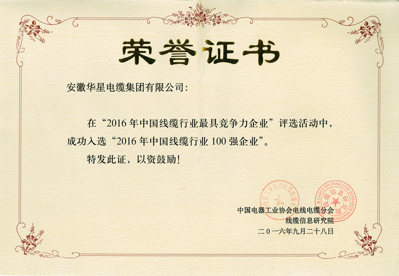 本评选结果是对全国线缆企业的规模、增长和效率、技术创新、客户满意度、品牌知名度、企业文化、企业家管理水平以及行业贡献等进行客观的分析并做出的综合评价。在上千家上规模线缆企业中,华星电缆脱颖而出,荣登100强榜单,这既是全国线缆行业对华星电缆近三十年发展的肯定,更是鼓励和鞭策。三十年来,华星电缆坚持“靠科技进步,创华星品牌;争同行一流,为顾客着想”的质量方针,秉承“诚信于人,成功自己”的经营理念,以优质的产品、合理的价格、完善的服务回报广大客户。三十年来,华星电缆在市场中逐步被客户信任青睐,在行业内被认可尊重,已经成为中国线缆行业举足轻重的代表性企业,拥有重要的地位和话语权。