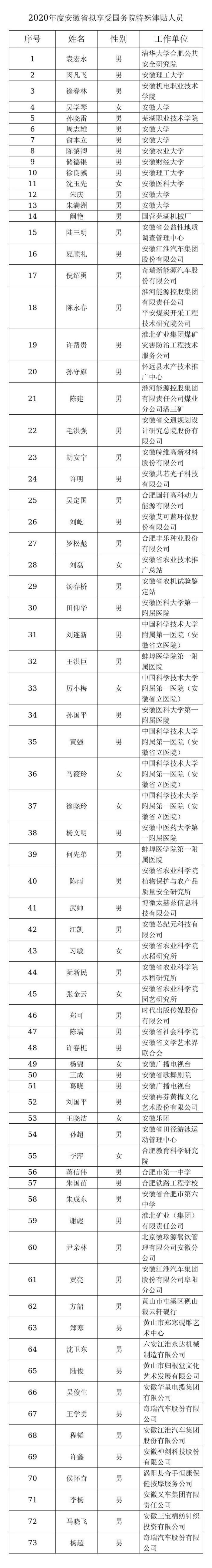 据安徽省人社厅网消息,6月28日,安徽省人力资源和社会保障厅发布《关于2020年度安徽省拟享受国务院和省政府特殊津贴人员名单的公示》。根据公示公告,经基层推荐、部门审核、专家评审并经厅长办公会研究同意,推荐安徽机电职业技术学院徐春林等73人为拟享受国务院政府特殊津贴人员,华星电缆总工程师吴俊生名单在列。