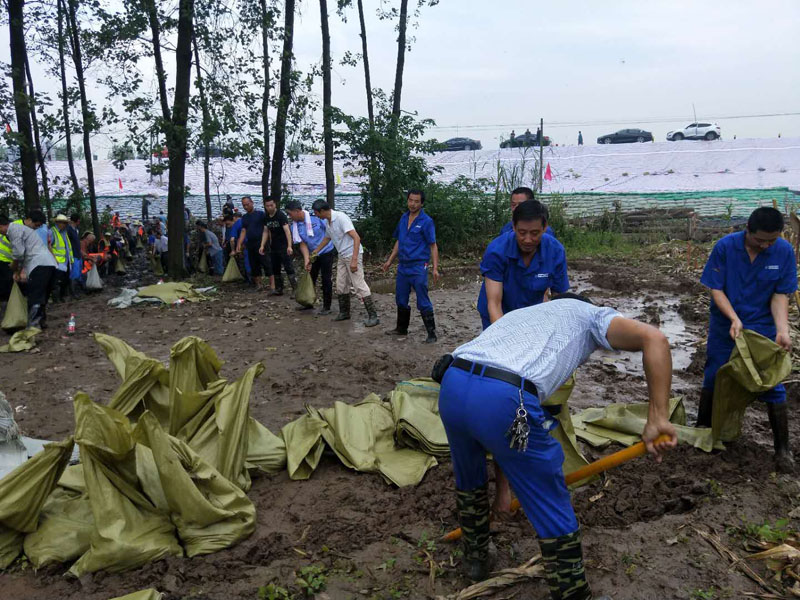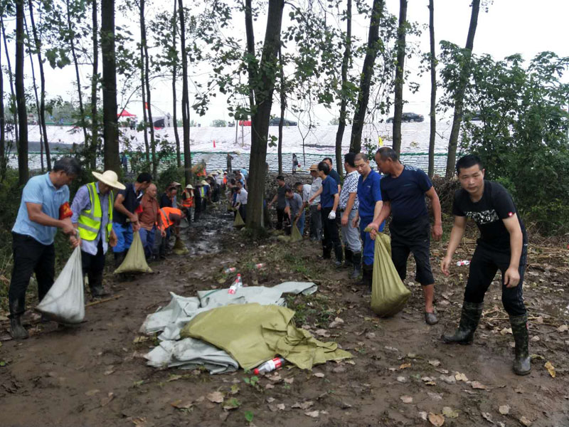 华星电缆接到抢险任务后,常务副总李远国率队30多名抢险队员立即前往支援,会同定兴村组织60余名民工参与抢险作业,值守在此的镇、村干部主动参与。按照上级确定的处置方案,仍采用“筑养水盆法”,使用土袋抢筑围井,壅高井内水位,降低渗透压,制止渗透破坏,稳定管涌险情。90余名抢险员分列两排传递黄沙、瓜子片等物资,从装袋到围井,所造的“养水盆”堆积沙袋约7层,高近1m。